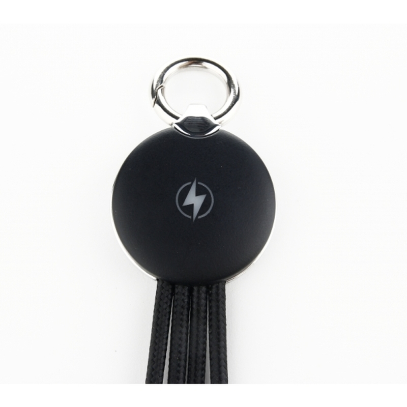 Cable for charging, includes 3 plugs: micro USB, lightning and type-C. Engraved logotype is enlightened when the cable is in use.