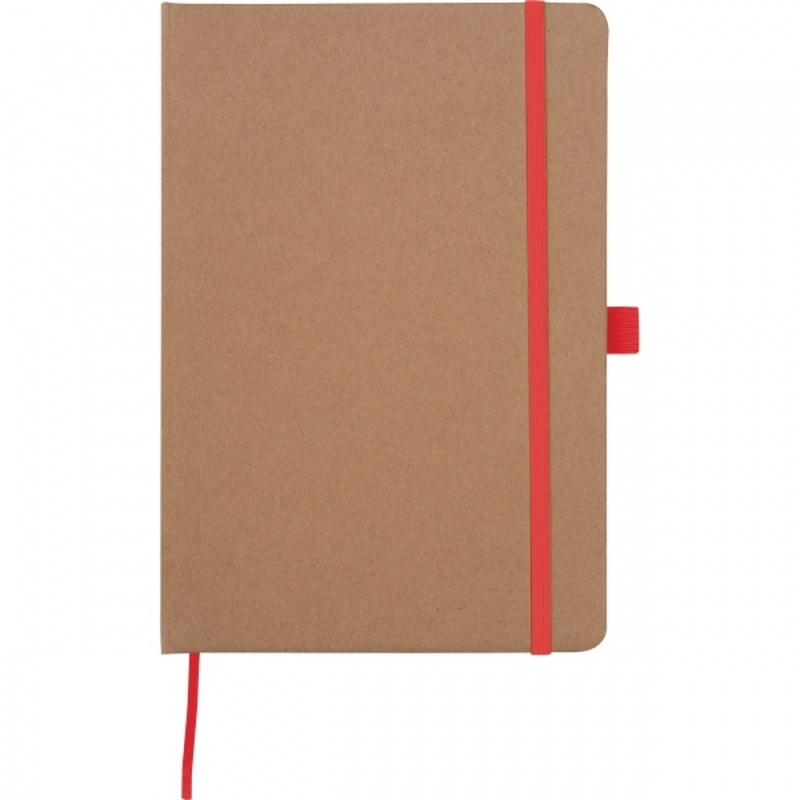 A5 notebook made from recycled paper with 160 lined pages, a bookmark, and a pen loop color-coordinated with the elastic closure band. Your logo is printed on the outside of the cover.