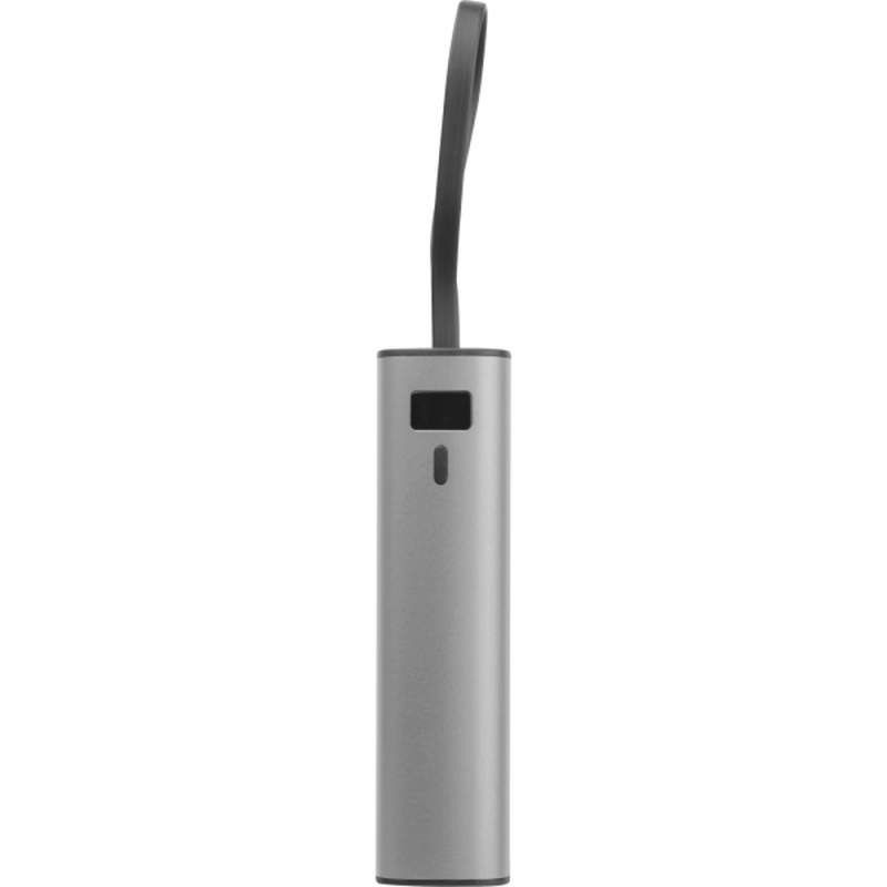 Power bank made of aluminum with a 5,000 mAh Li-ion battery, charge level display, and integrated USB-C charging cable. A 30 cm Type-A to Type-C charging cable is included. Your logo is applied below the display using laser engraving.