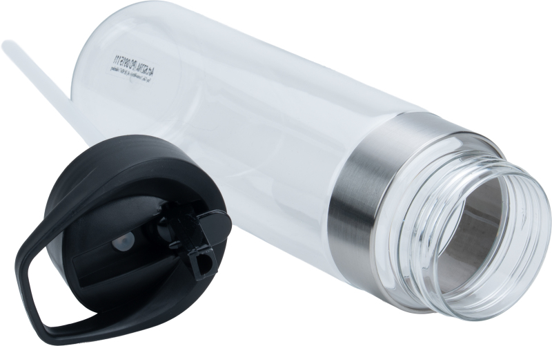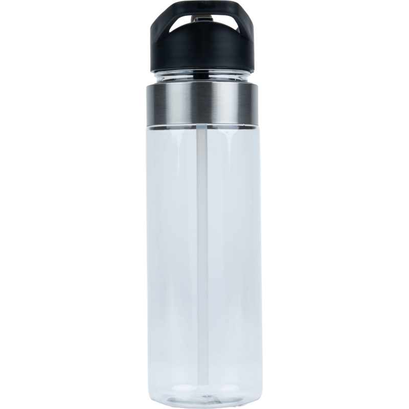 Sports bottle (700 ml capacity) made of PET with a straw, foldable drinking device and stainless steel ring. We will print your logo on the bottle. Engraving on the stainless steel ring is possible on request.