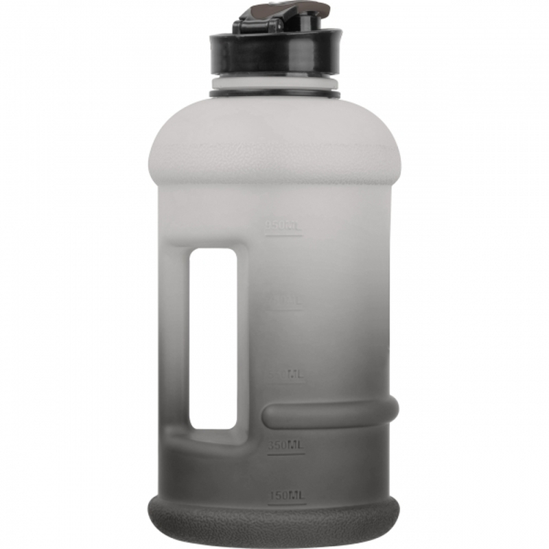 Extra-large drinking bottle made of plastic with a drinking indicator and a capacity of 1,300 ml. The grip indentations ensure a secure hold while drinking, and the velvety surface provides a particularly pleasant feel. Your logo is applied to the lower third of the bottle.