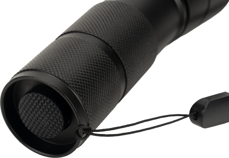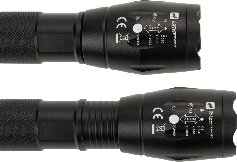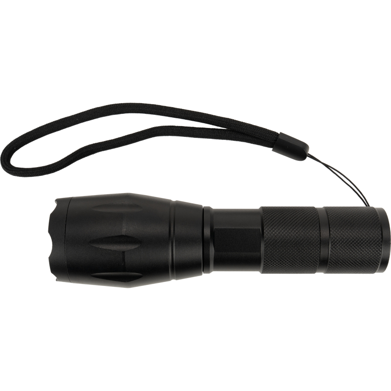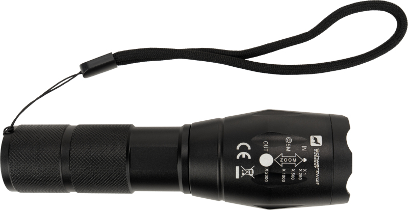 Outdoor flashlight Schwarzwolf with wrist strap. Extending T6 diode allows intensive lighting for small size of light source. It has a function of regulating the focalization and switching the light. Baterries 3 × AAA included.
