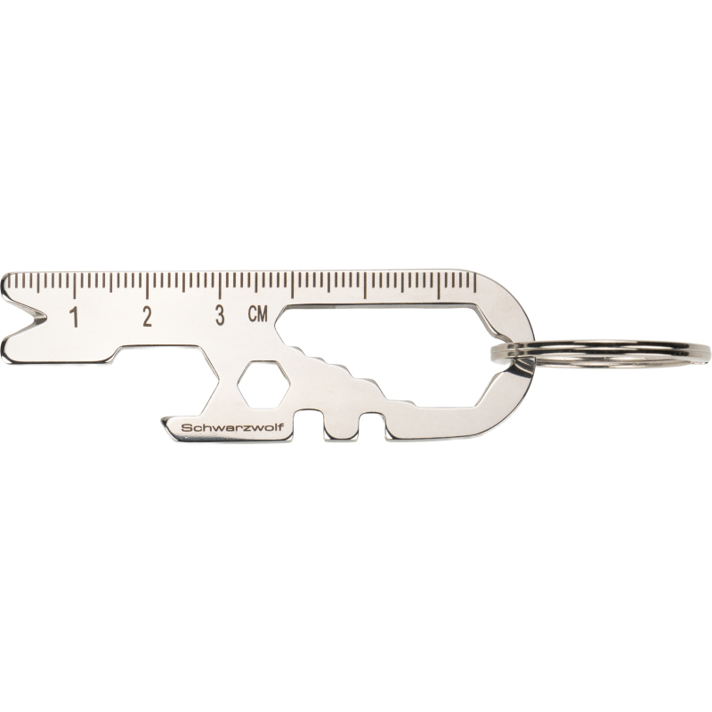 Multifunctional Schwarzwolf keychain contains 13 tools, including: a ruler, magneat, key in 6 sizes, and a bottle opener. Packed in a Schwarzwolf gift box. Material: S/S 420 steel.