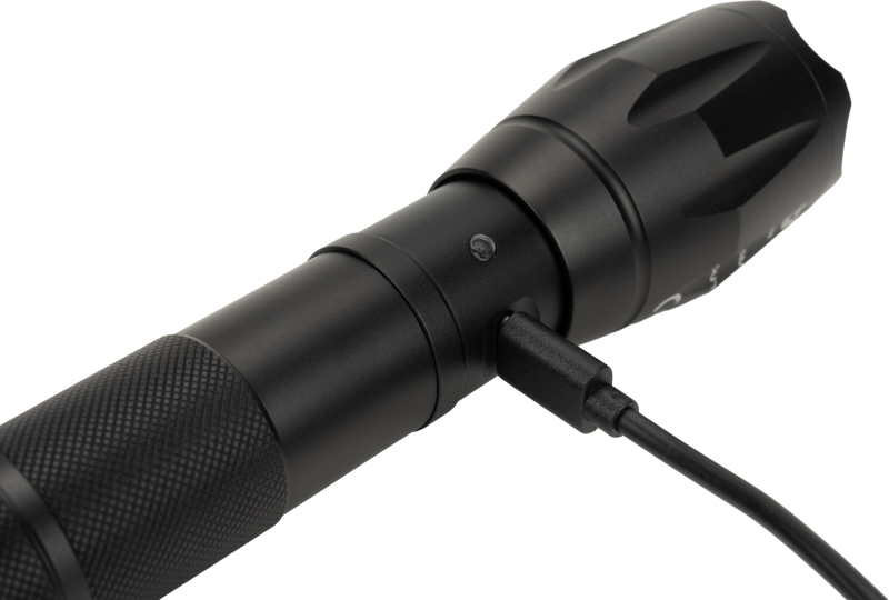 Flashlight with wrist strap that contains CREE T6 diode. Thanks to the extending head it allows you to regulate the focalization and switch power of the light. It has 5 modes of lighting: weak, medium, stronger, flashing and SOS. Comes with a rechargeable battery with 2200 mAh capacity and USB Micro cabel. Flashlight can be also used with 3 AAA bateries. Luminosity: 270 lumens