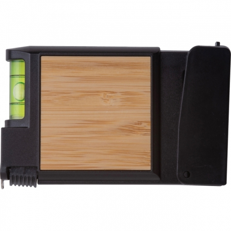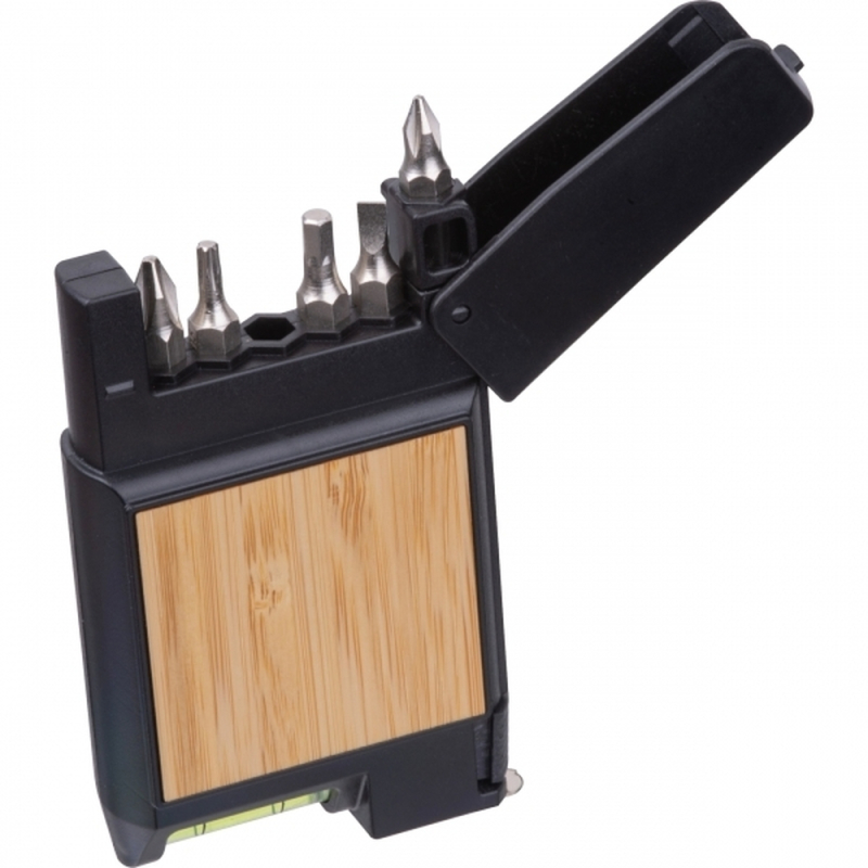 3-meter tape measure made of plastic with a spirit level, locking button, and five different bits. Your logo is applied to the bamboo inlay.
