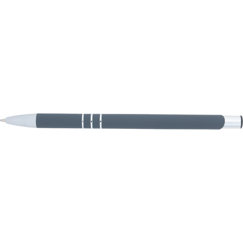Slim metal ballpen with rubber finish and blue writing plastic refill. Your logo will be engraved below the clip.