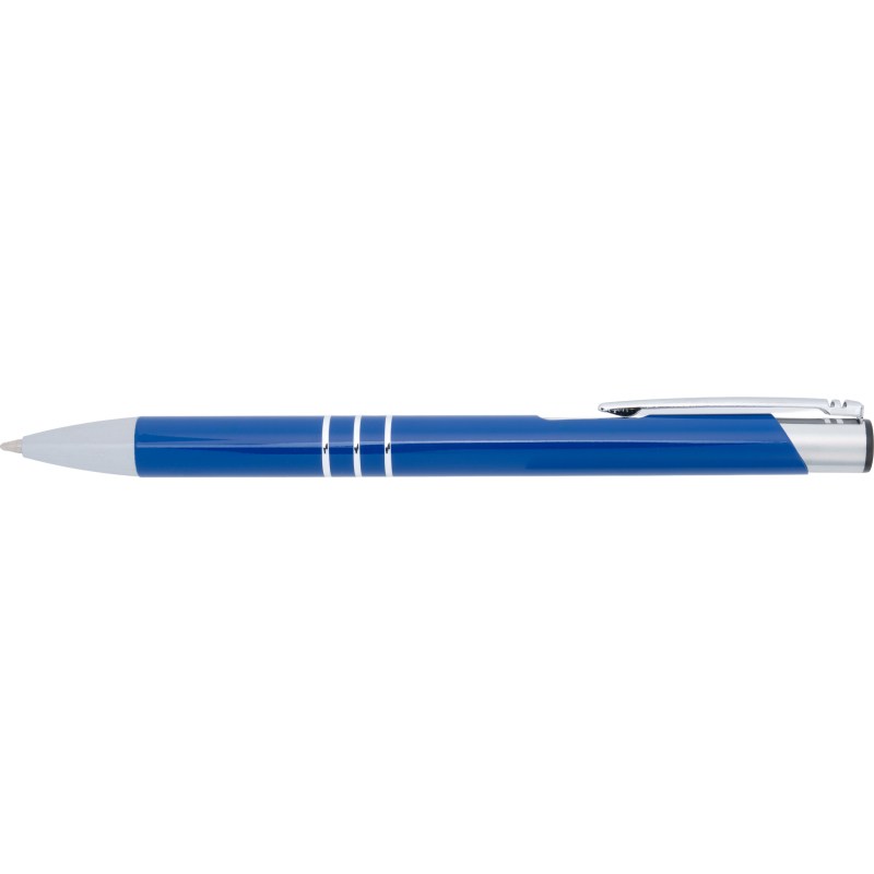 Fully lacquered metal ballpen with 3 decorative rings and blue-writing refill with large capacity. Your logo will be engraved to the right of the clip.