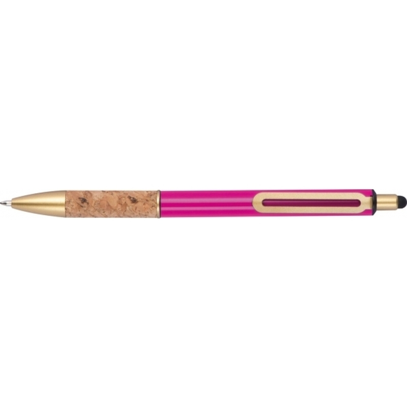 Metal ball pen with golden applications, blue-writing refill and cork grip zone. Your logo will be engraved to the right of the clip.