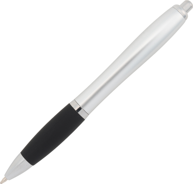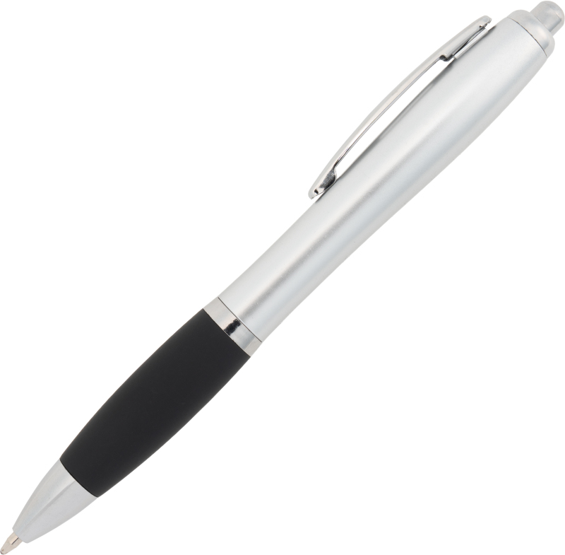 Ballpoint pen with blue writing large capacity refill and color contrast soft touch grip zone. We print your logo on the right side of the clip.