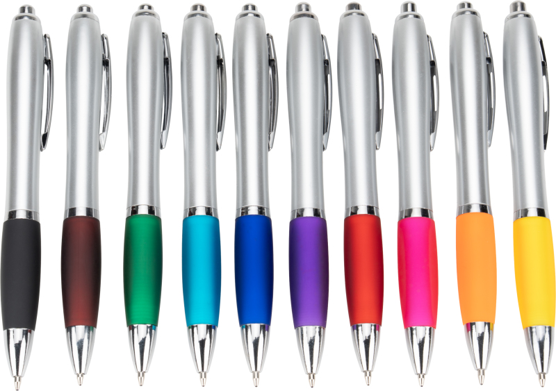Ballpoint pen with blue writing large capacity refill and color contrast soft touch grip zone. We print your logo on the right side of the clip.