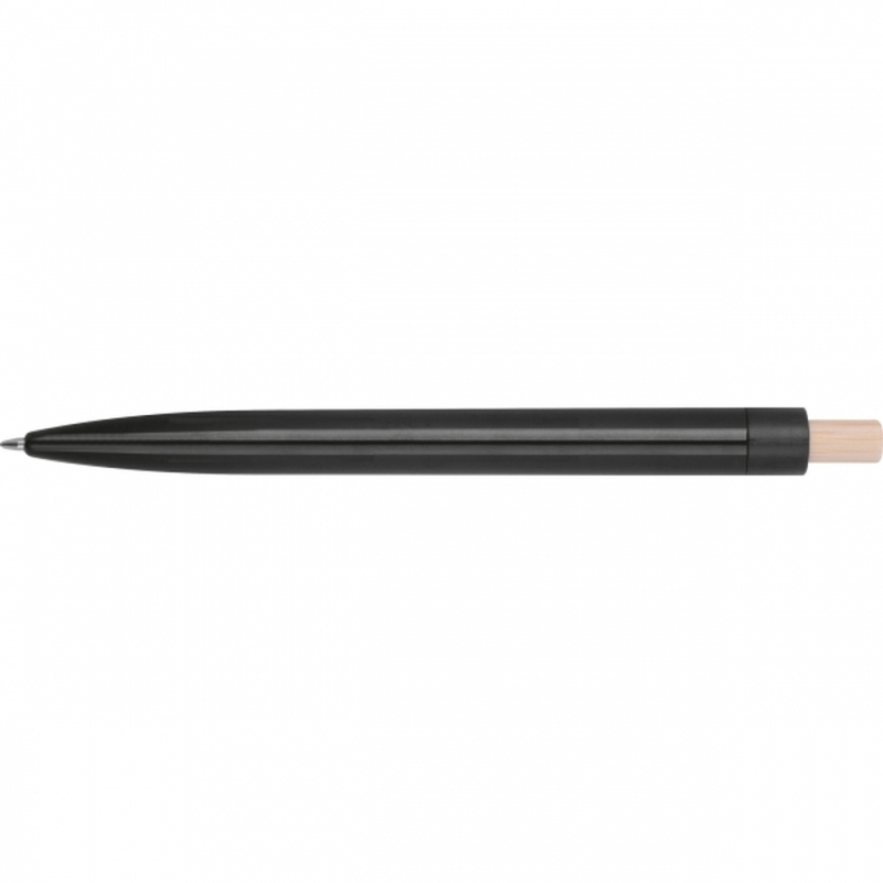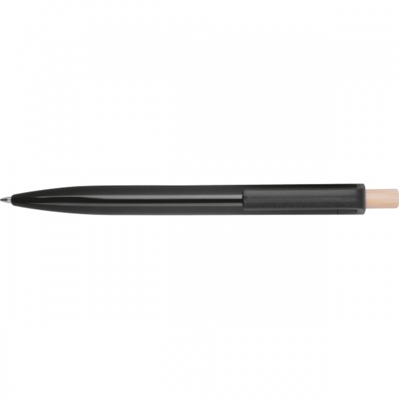 Ballpoint pen made from recycled ABS with a bamboo push button. It features a blue-writing plastic refill. Your logo is printed on the barrel below the clip.