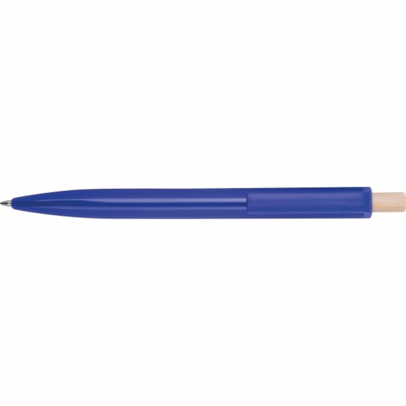 Ballpoint pen made from recycled ABS with a bamboo push button. It features a blue-writing plastic refill. Your logo is printed on the barrel below the clip.