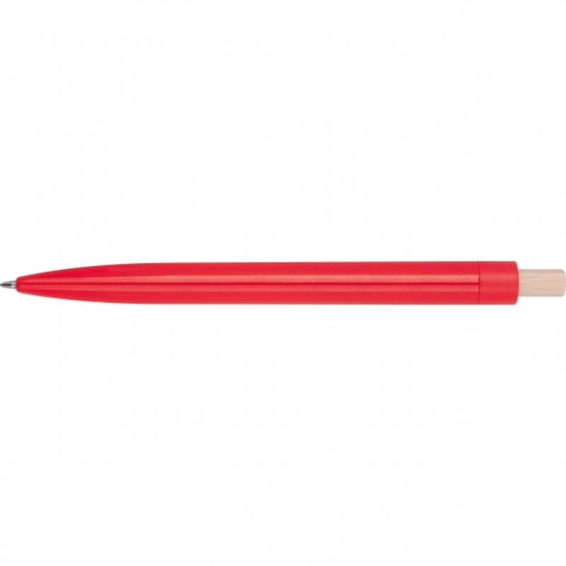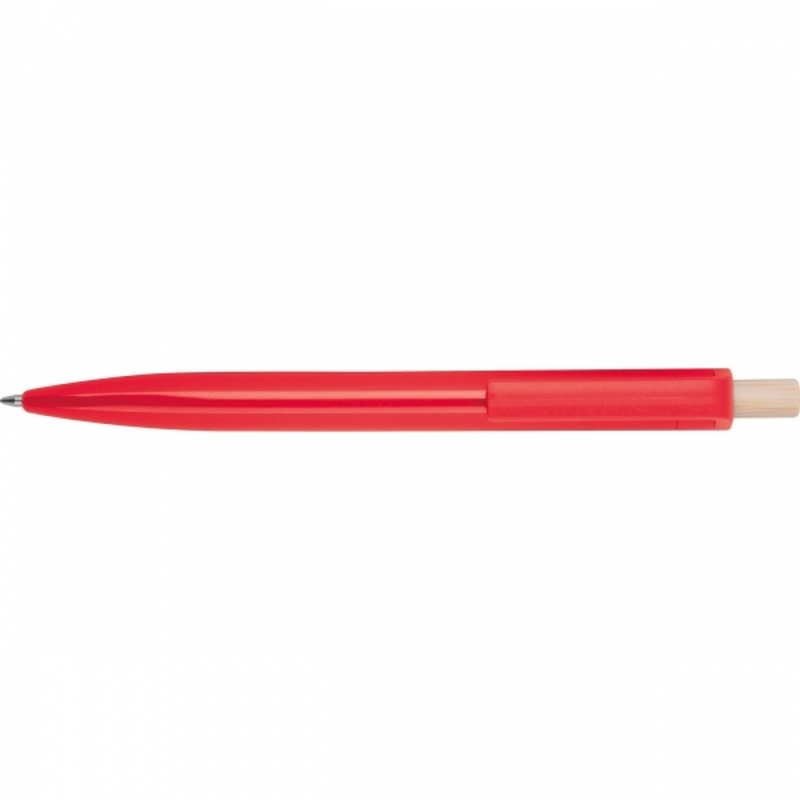 Ballpoint pen made from recycled ABS with a bamboo push button. It features a blue-writing plastic refill. Your logo is printed on the barrel below the clip.
