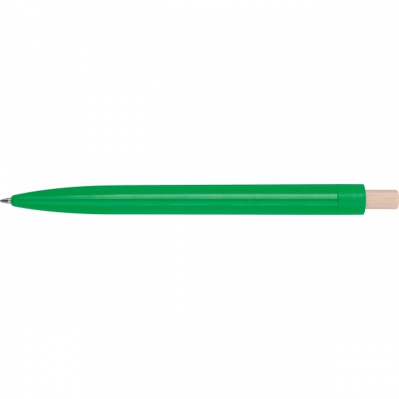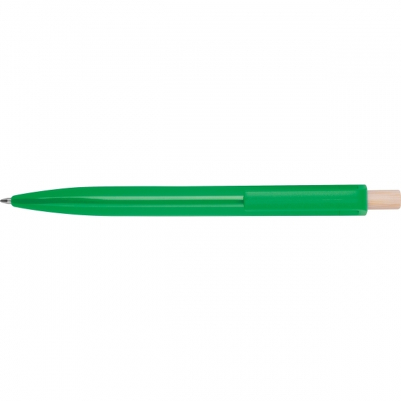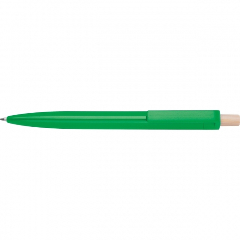 Ballpoint pen made from recycled ABS with a bamboo push button. It features a blue-writing plastic refill. Your logo is printed on the barrel below the clip.