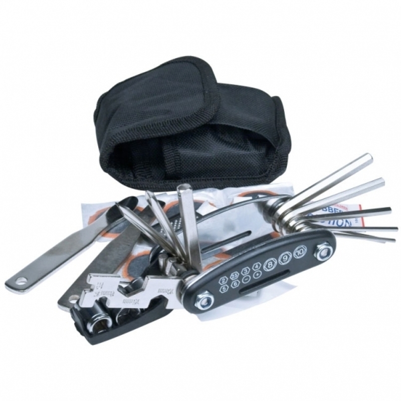 Zestaw narzędzi do naprawy usterek rowerowych, składa się z 17 metalowych elementów. Komplet narzędzi rowerowych pakowany w etui z poliestru.