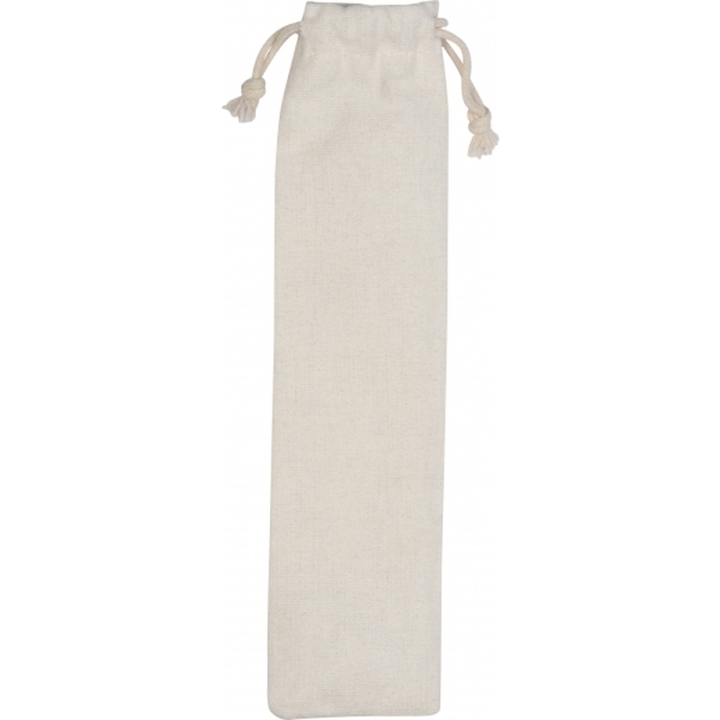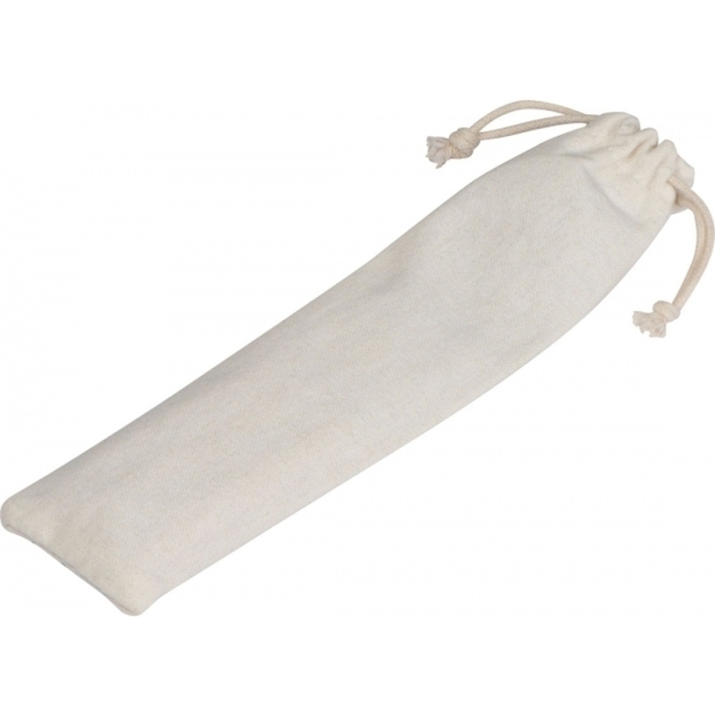 Zestaw sztućców wykonanych ze stali nierdzewnej i drewna, zapakowany w bawełniany woreczek. Zestaw zawiera łyżkę, widelec i nóż.