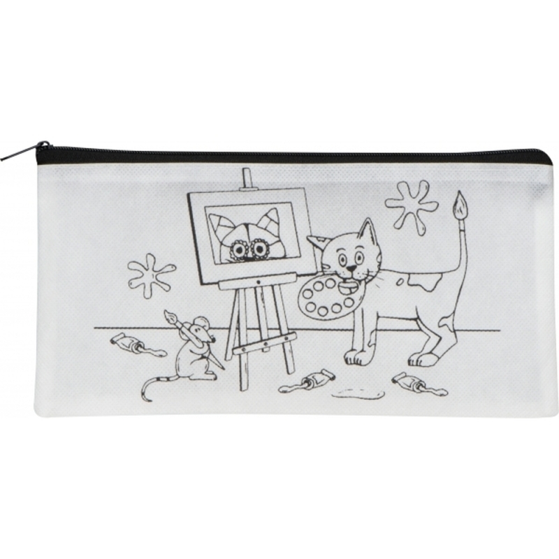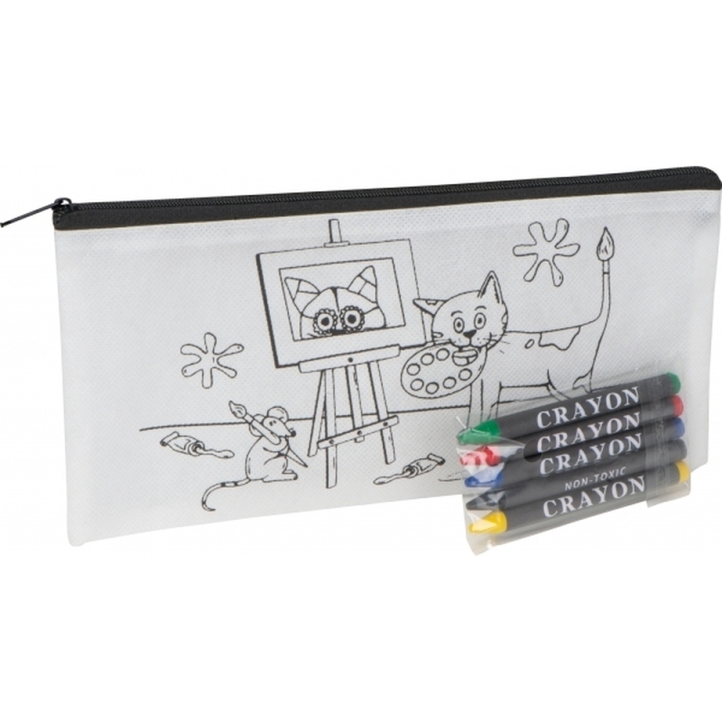 Piórnik wykonany z non-woven z kolorowanką i 5 kredkami świecowymi do kolorowania.