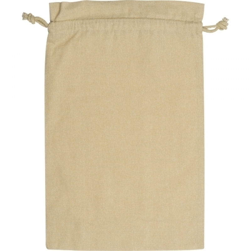 Duży woreczek bawełniany wykonany z bawełny pochodzącej z recyklingu, z certfikatem Oeko-Tex STANDARD 100, gramatura 110g/m². Woreczek zamykany za pomocą sznureczków ściągających.
