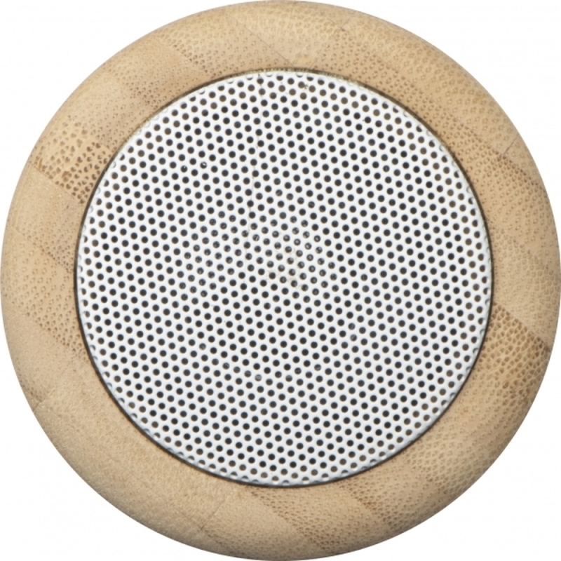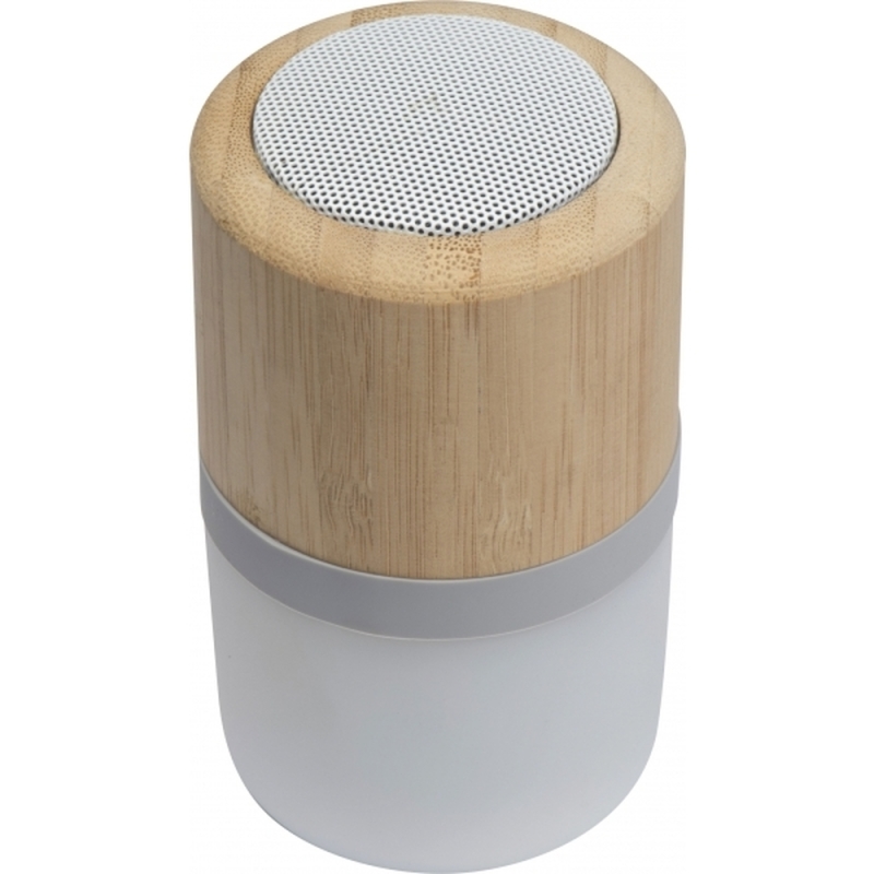 Bluetooth 5.0 speaker made of ABS and bamboo with color-changing LED light, 300 mAh battery, charging time 2 hours and a range of up to 10 meters. Your logo will be placed onto the speaker.