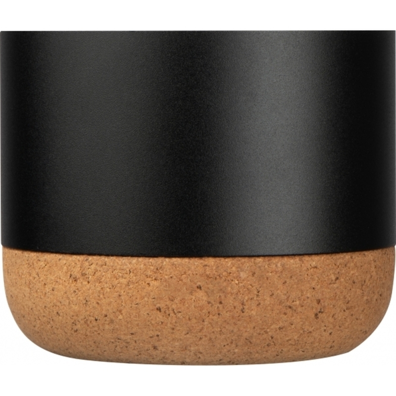 Stylish Bluetooth speaker (BT version 5.0) made of recycled aluminum with a cork base. It features a 300 mAh battery with a 2-3 hour charging time, a USB-C charging cable, and a Bluetooth range of approximately 10 meters.