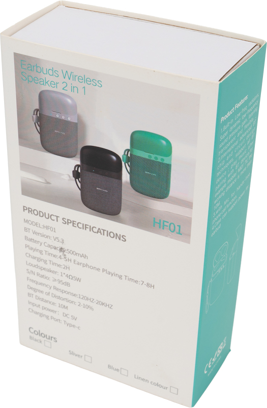 The HF01 model is an innovative combination of a portable speaker and wireless headphones in one device – perfect for those who value convenience and practicality. Featuring Bluetooth 5.3, it ensures a stable and fast connection without interference, and the 500 mAh battery provides 4–5 hours of speaker use or 7–8 hours of headphone operation after approximately 2 hours of charging via the USB Type-C port. The built-in 1 × 4Ω 5W speaker delivers clear and dynamic sound, while a signal-to-noise ratio of ≥ 95 dB ensures crisp audio without noise. With a frequency response of 120 Hz – 20 kHz and distortion levels of 2–10%, it guarantees an enjoyable listening experience across various music genres. The device has a range of up to 10 meters, is powered by DC 5V, and is available in three stylish colors: black, silver, and blue.