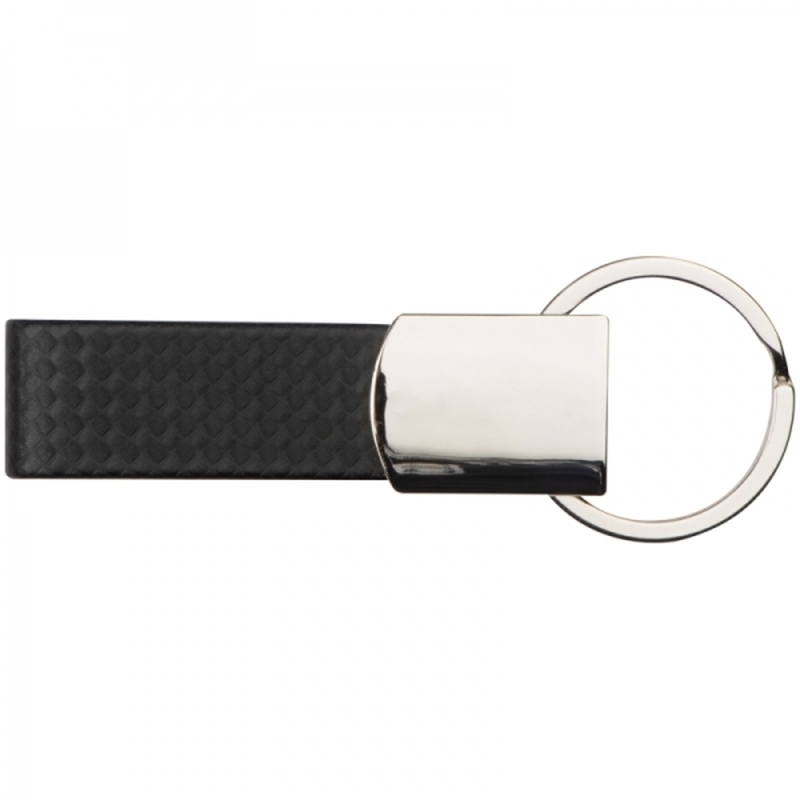 Elegant metal key ring with carbon-look strap. Your logo will be engraved on the chromed surface.