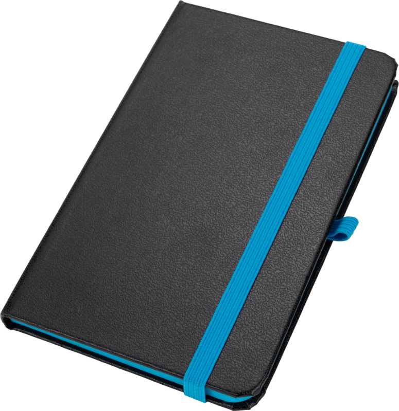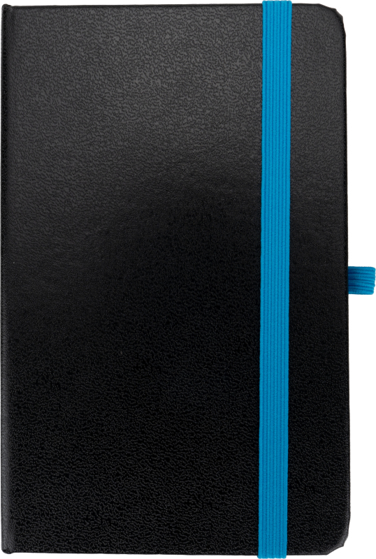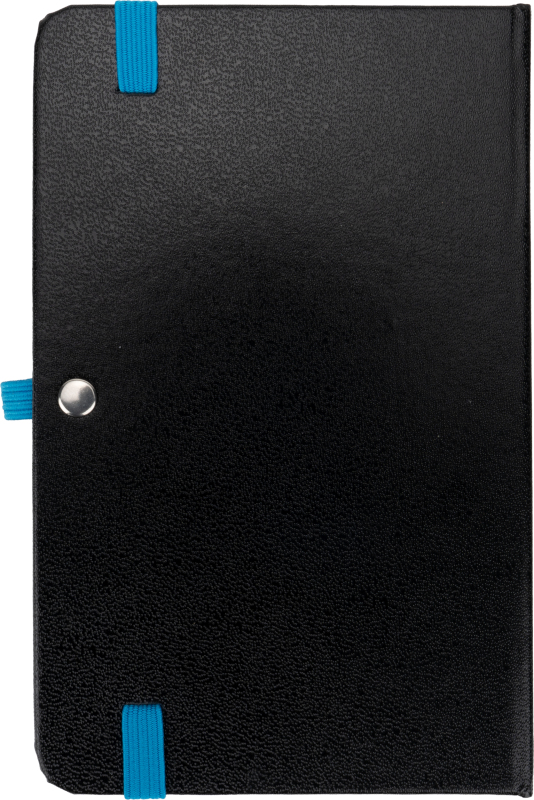 Notebook with black PU cover and 160 lined pages. Elegant look through colorful accents. We will print your logo on the cover.