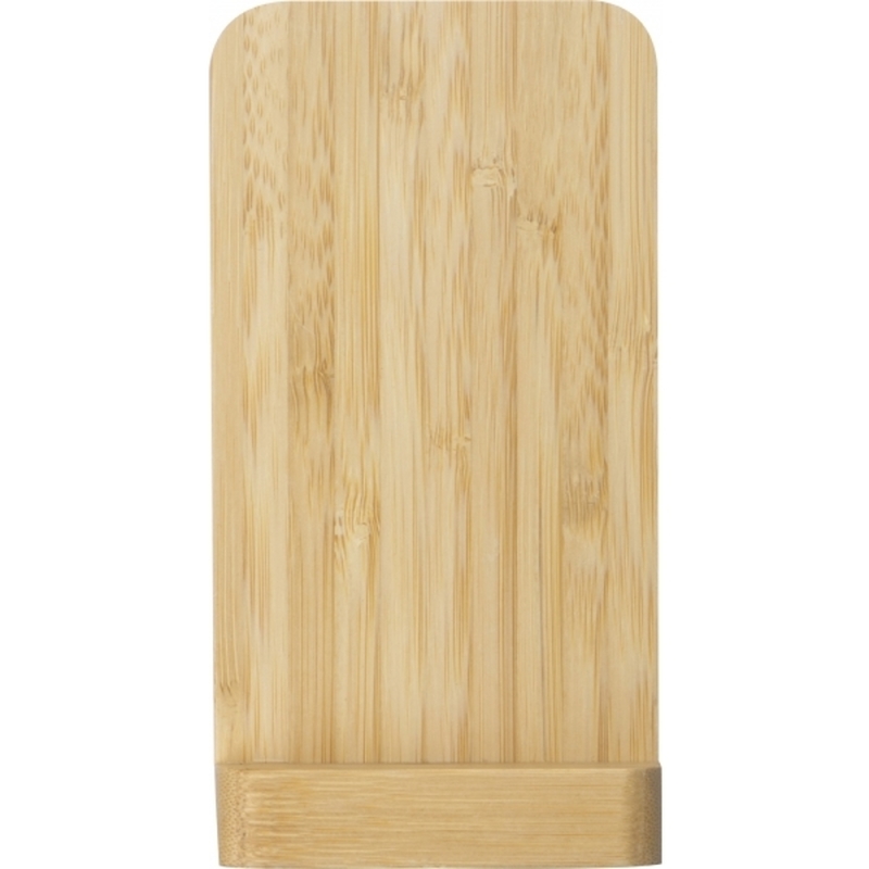 Bamboo wireless charger and smartphone holder. Input DCSV = 2A, wireless output 10W, including charging cable. Your logo will be engraved on the bottom of the charger.