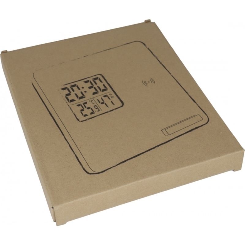 Bamboo weather station / wireless charger with digital display showing temperature, humidity and time. Provides a stable stand. Your logo will be engraved on the front.