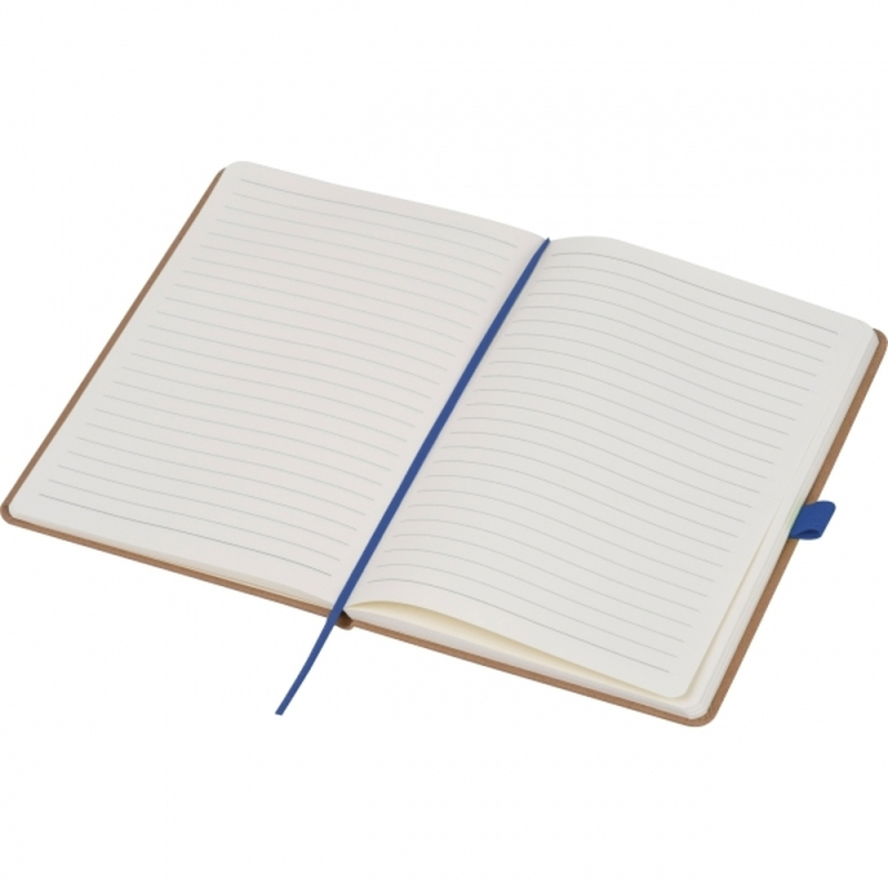 A5 notebook made from recycled paper with 160 lined pages, a bookmark, and a pen loop color-coordinated with the elastic closure band. Your logo is printed on the outside of the cover.