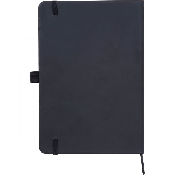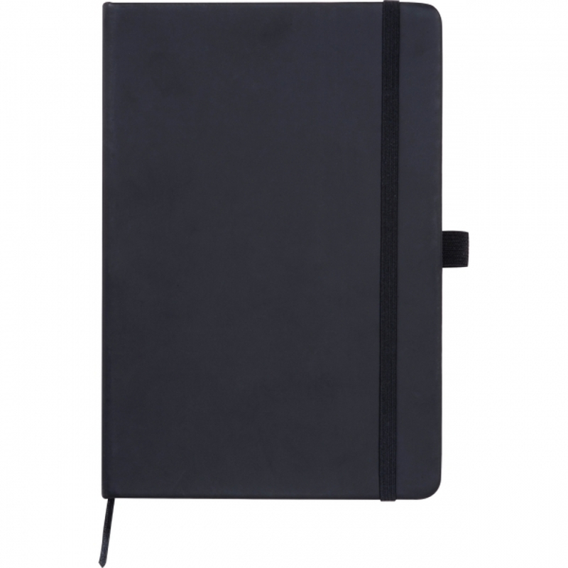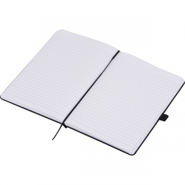 A5 notebook with a PU cover, bookmark, elastic closure band, pen loop, and 120 lined pages made of stone paper. This special paper is made from calcium carbonate and is oil- and water-resistant, anti-static, non-grainy, flame-retardant, and most importantly, tear-resistant. Your logo is printed on the outside of the cover.