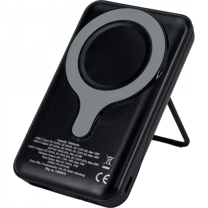 2-in-1 magnetic wireless power bank with stand, 10,000 mAh capacity. The stand allows the power bank to also be used as a smartphone holder. Includes a 30 cm cable with a USB-C connector, and the power bank features both USB-C and USB-A ports.