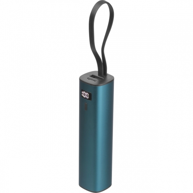 Power bank made of aluminum with a 5,000 mAh Li-ion battery, charge level display, and integrated USB-C charging cable. A 30 cm Type-A to Type-C charging cable is included. Your logo is applied below the display using laser engraving.