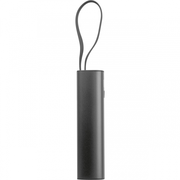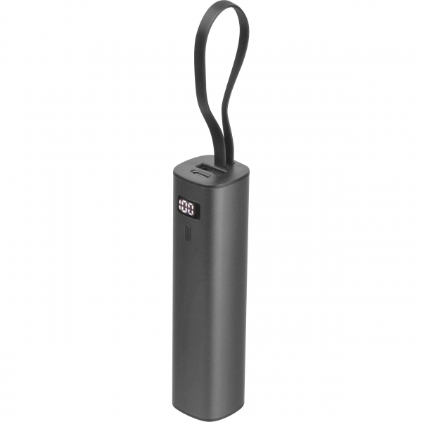Power bank made of aluminum with a 5,000 mAh Li-ion battery, charge level display, and integrated USB-C charging cable. A 30 cm Type-A to Type-C charging cable is included. Your logo is applied below the display using laser engraving.