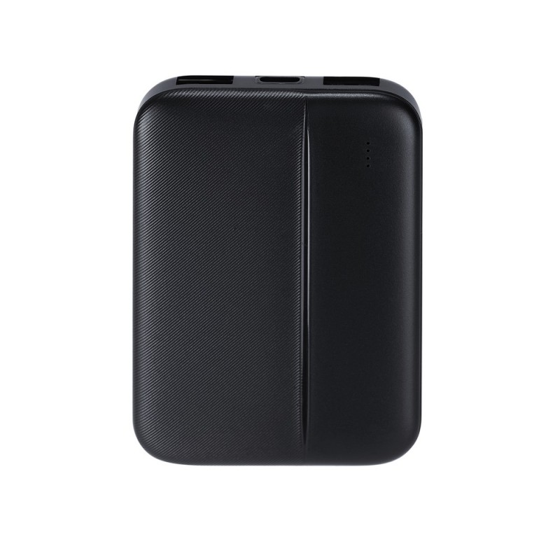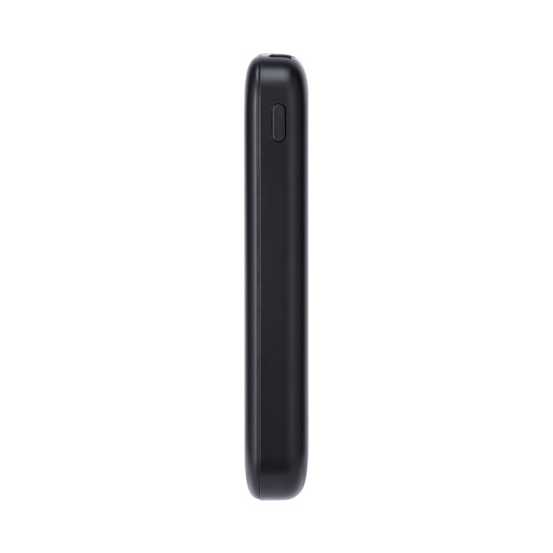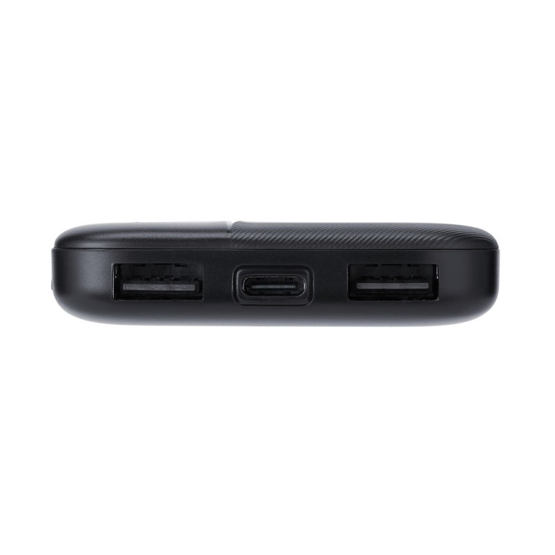 The power bank with a capacity of 5000 mAh and a power of 10W is ultralight and ultracompact, making it very convenient for everyday use. Equipped with a rechargeable battery, it is compatible with all popular models of smartphones, tablets, and other mobile devices. The device has protections against overcharging, excessive discharge, overload, and short circuit, ensuring safe usage. The power bank automatically turns on and off – simply connect a device to one of the output ports to start charging automatically. The battery status can be easily checked by pressing the side button, and four LED indicators show the remaining energy level. The power bank has two 10W USB-A output ports for charging devices and one 10W USB-C input port for charging the power bank itself.