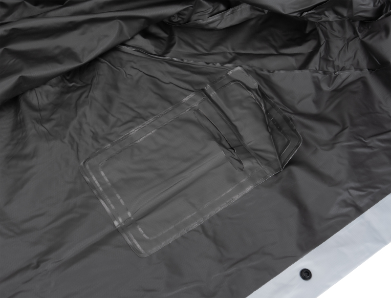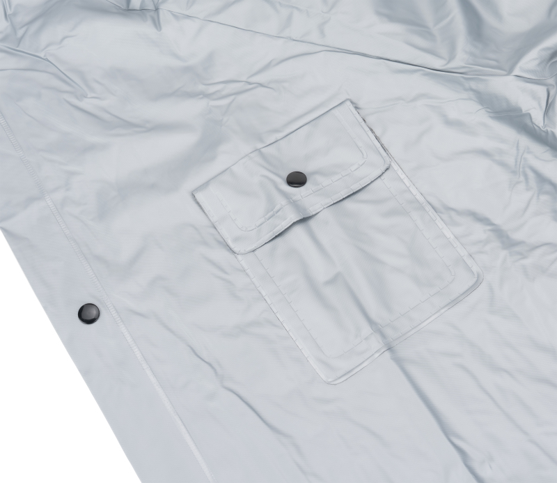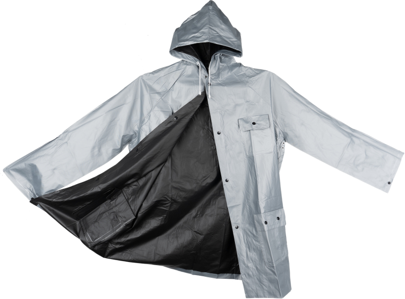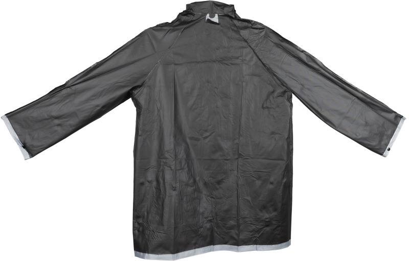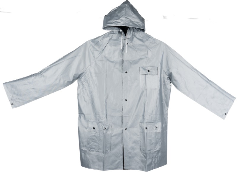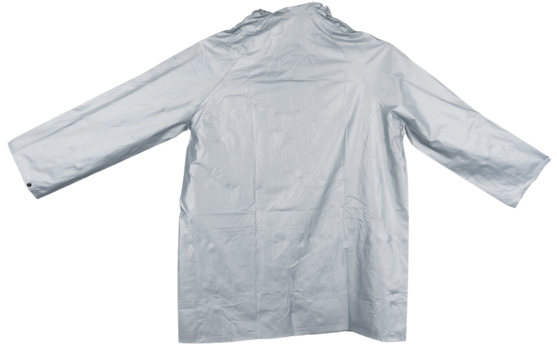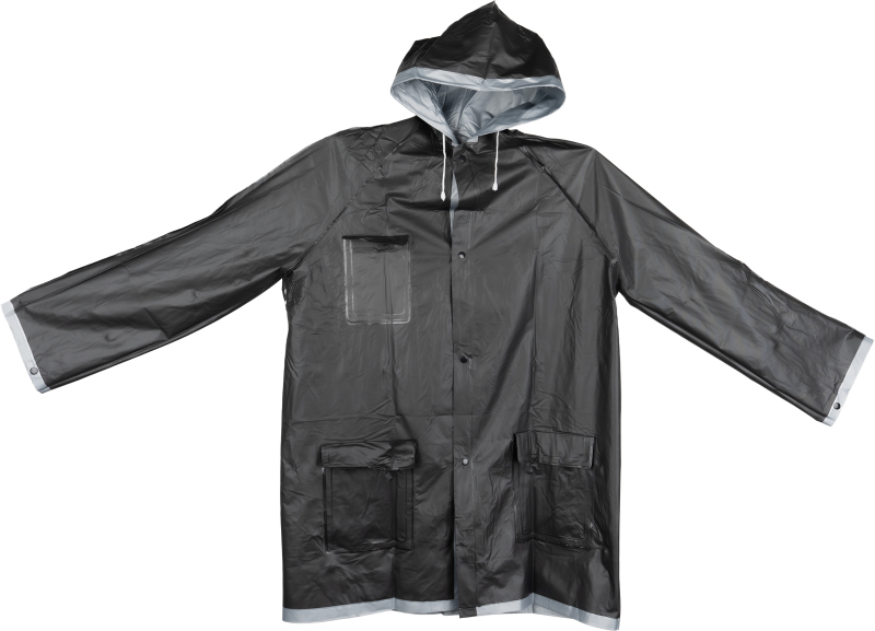 Reversible PVC rain jacket with hood, two pockets and press studs. Back of the coat - 103 x 60 cm.