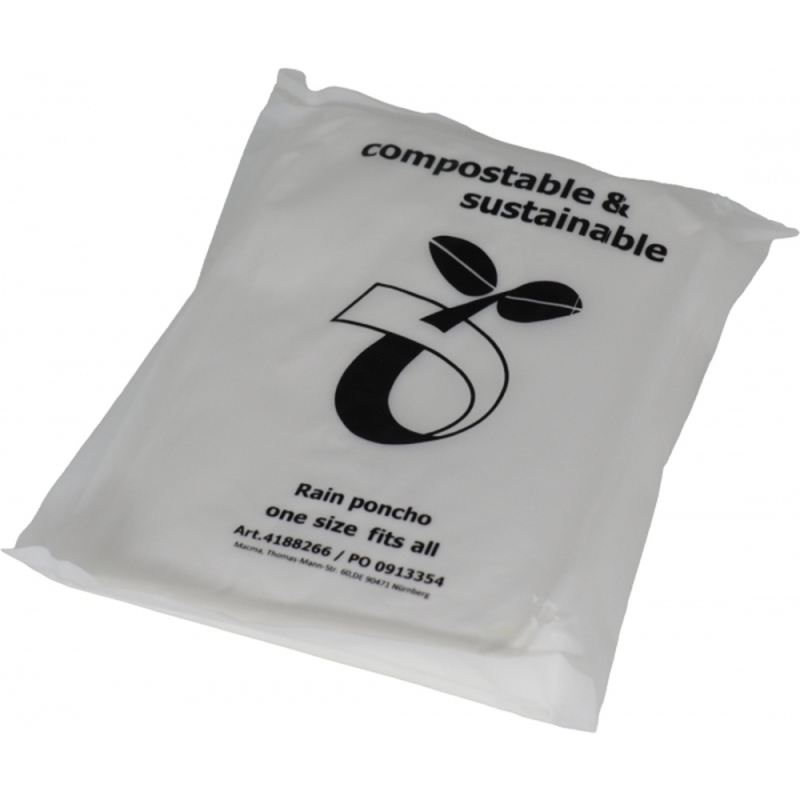 Phthalate-free compostable rain poncho made from PLA with carrier bag. This poncho is a sustainable alternative. Your logo will be printed on the bag.