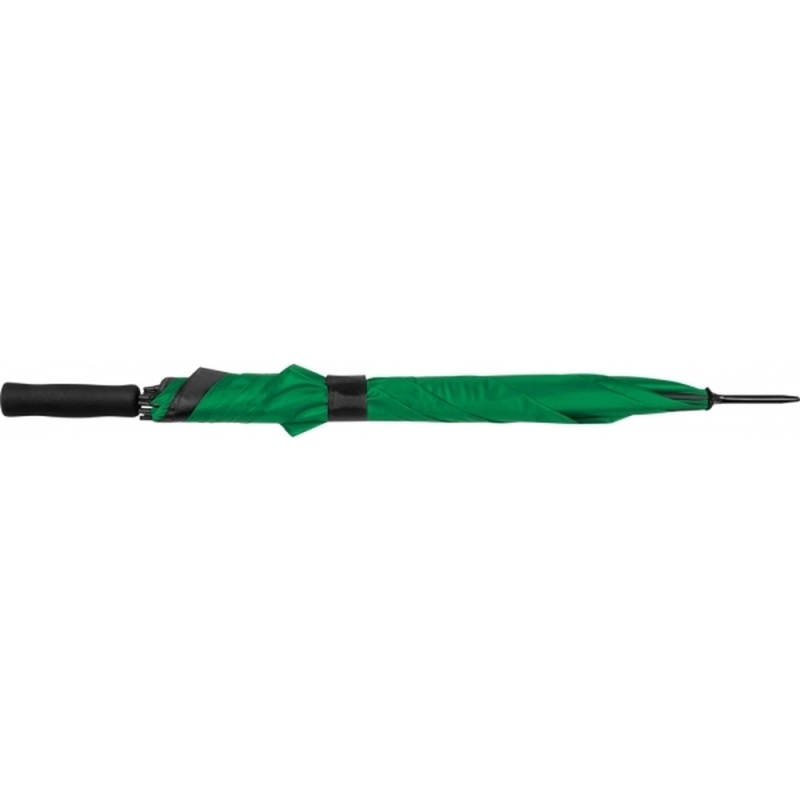 Automatic 170T polyester umbrella with aluminium shaft, a soft-touch handle and panel in different colours. Your logo will be printed on one panel.