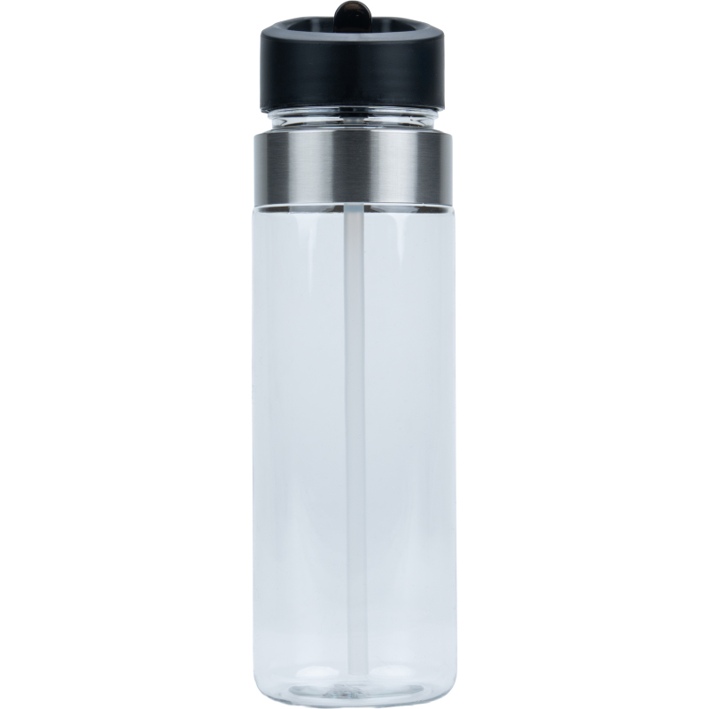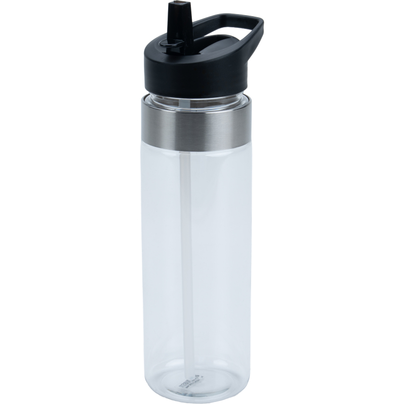 Sports bottle (700 ml capacity) made of PET with a straw, foldable drinking device and stainless steel ring. We will print your logo on the bottle. Engraving on the stainless steel ring is possible on request.