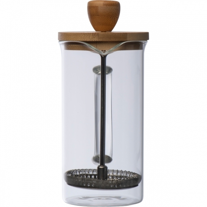French Press made of borosilicate glass with press plunger, bamboo lid and a filling capacity of 350 ml. Your logo will be placed on the jug. Engraving on the lid possible on request.