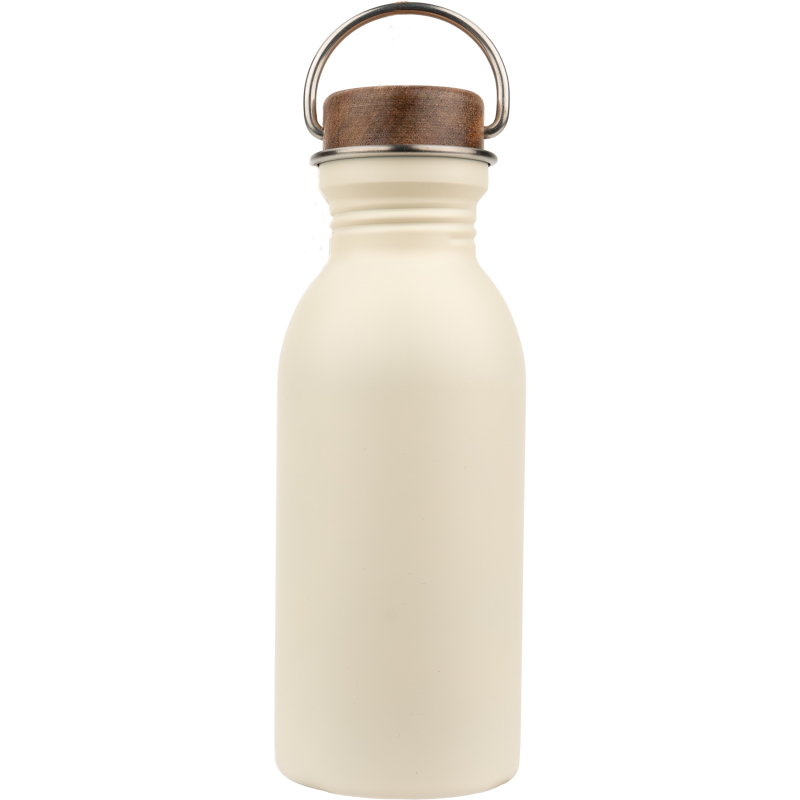 Drinking bottle made of recycled stainless steel, closed with an acacia wood cap, equipped with a carrying handle. Capacity 500 ml.