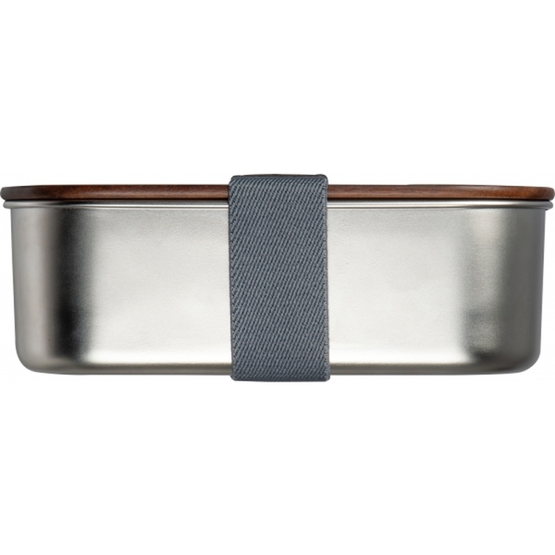 Lunch box made of recycled stainless steel, with an acacia wood lid and elastic band. Capacity 1000 ml.