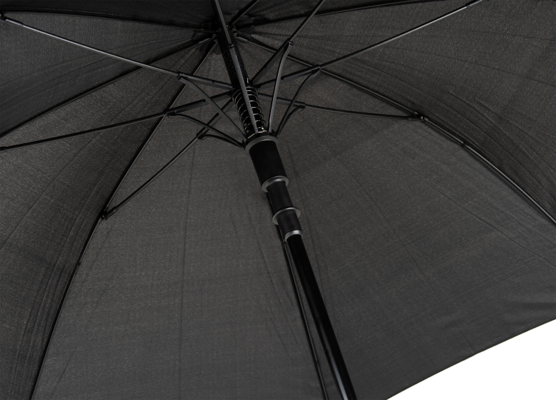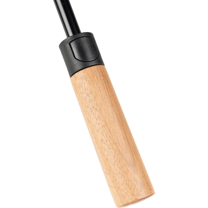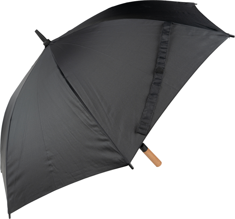 Automatic umbrella made of RPET material, with a fiberglass frame and acacia handle.