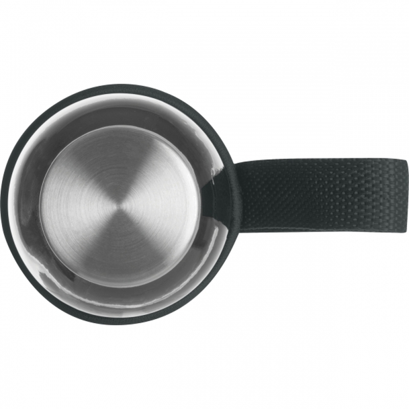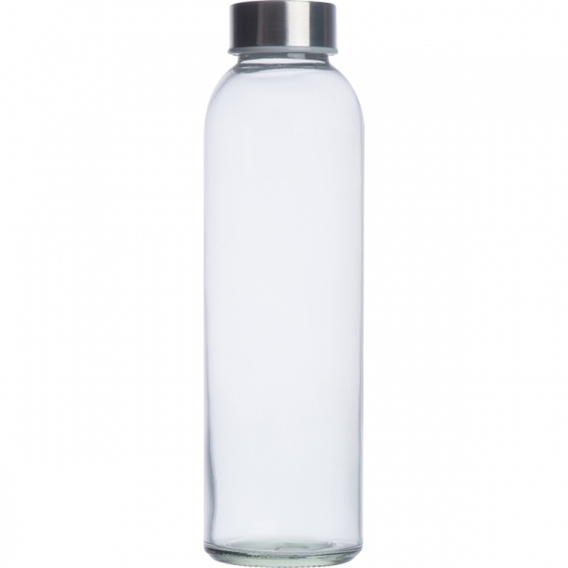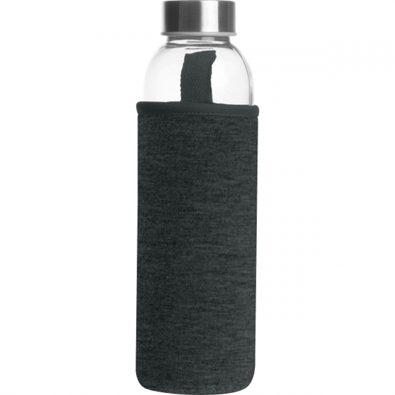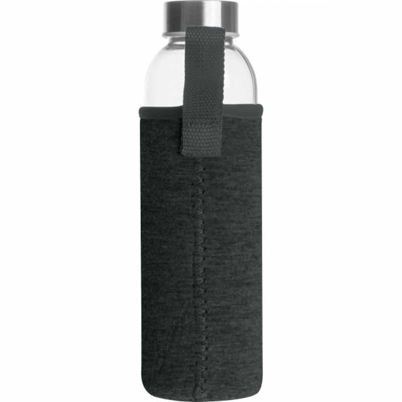 Leak-proof drinking bottle made of glass with stainless steel lid and a capacity of 500 ml. The bottle is delivered in a matching neoprene sleeve with carrying strap.