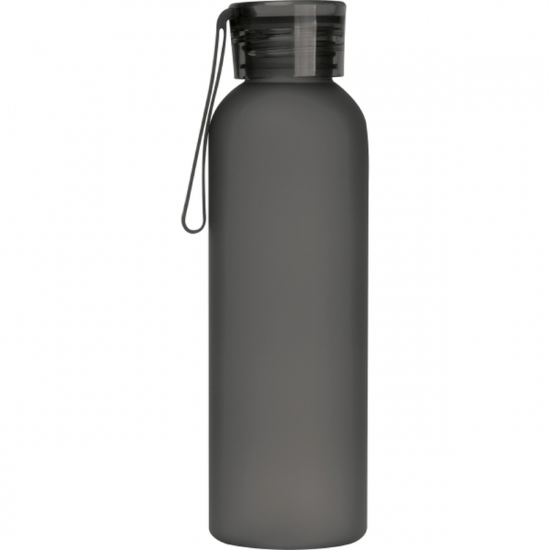 Drinking bottle made of PET with a rubber carrying handle on the lid and a capacity of 600 ml. The frosted surface of the bottle provides a particularly pleasant feel. Your logo is printed on the bottle.