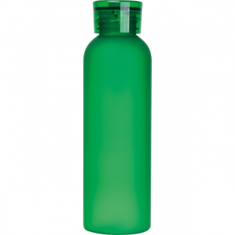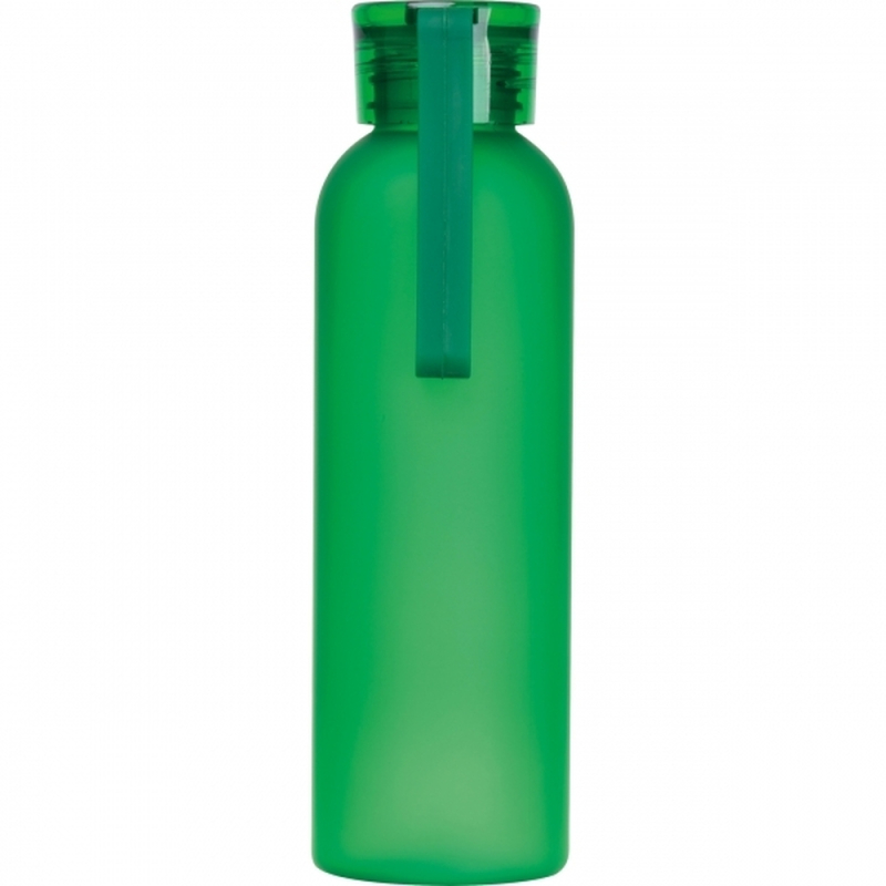 Drinking bottle made of PET with a rubber carrying handle on the lid and a capacity of 600 ml. The frosted surface of the bottle provides a particularly pleasant feel. Your logo is printed on the bottle.