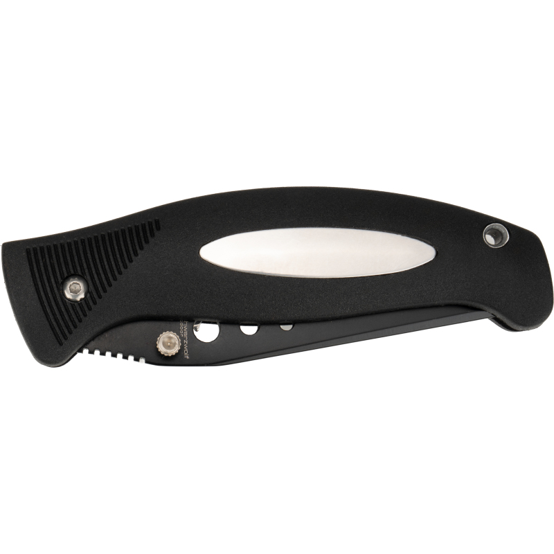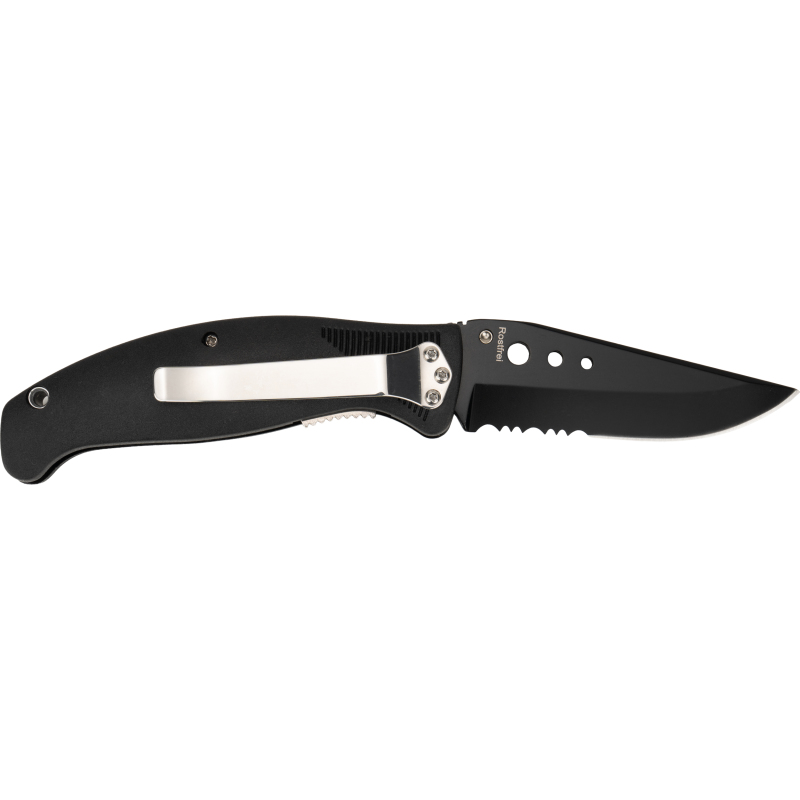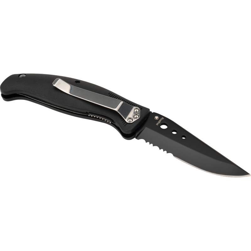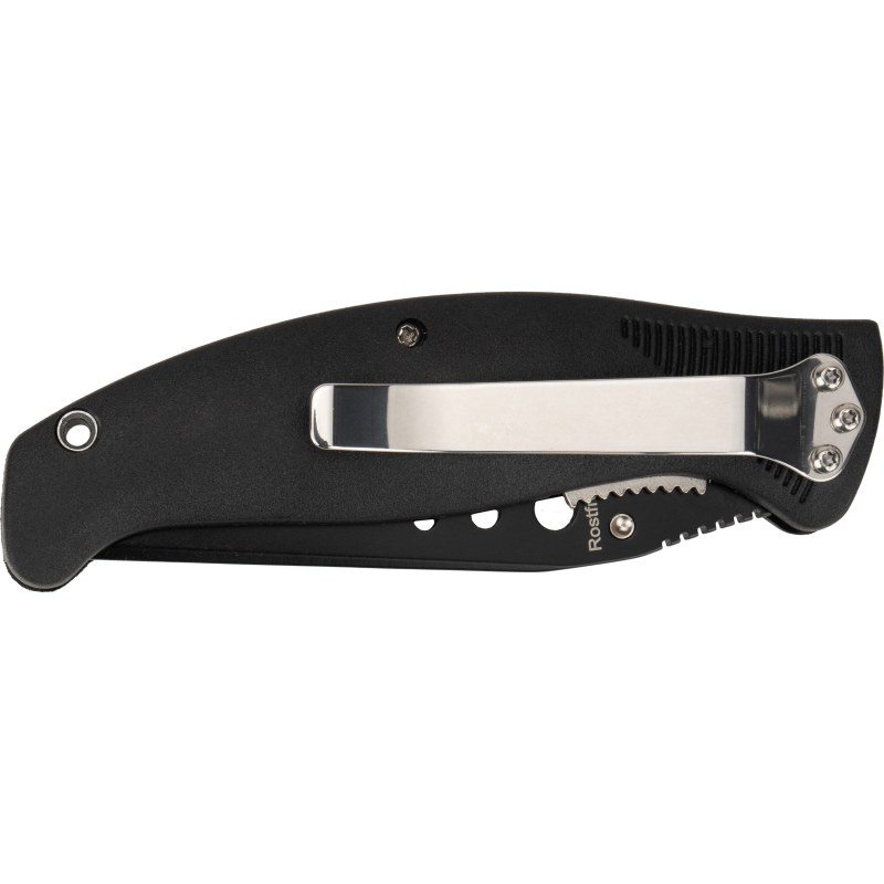 Folding knife Schwarzwolf with plastic handle, belt clip and safety lock. Material: stainless steel and plastic.