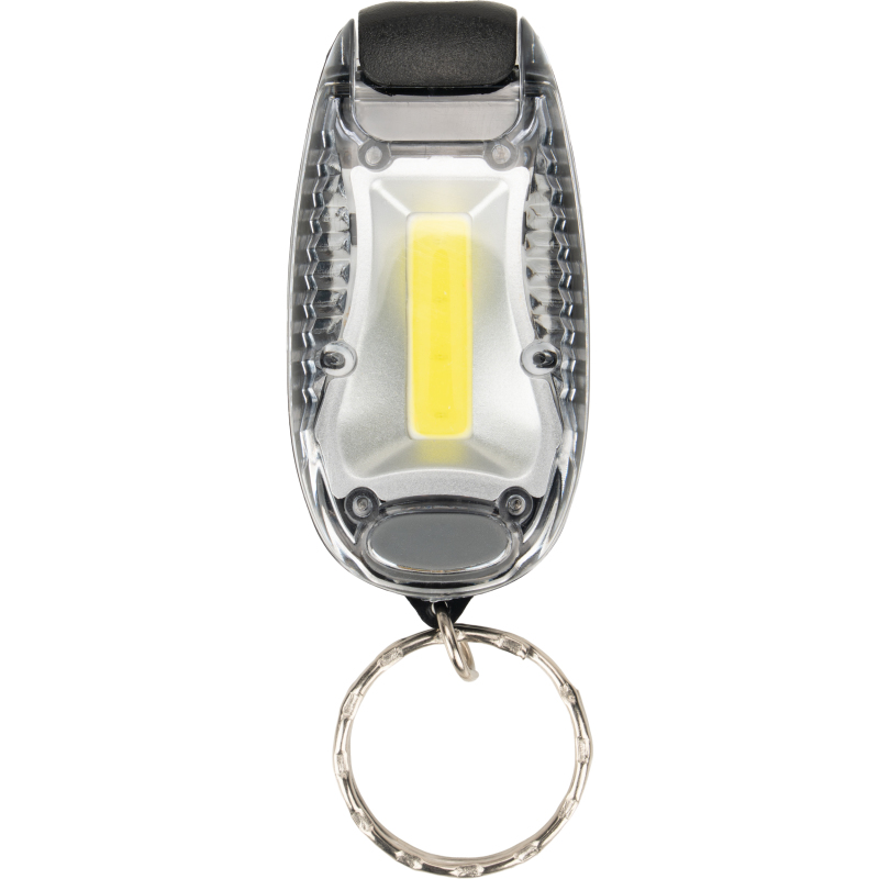 Small black Schwarzwolf light with COB diode and flashing mode. Possibility of holding with plastic clip or keyring. 2 × 3 V CR2032 Batteries included.