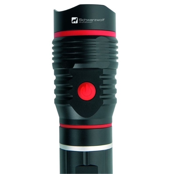 Outdoor metal flashlight Schwarzwolf. It includes Cree XPE diode and extending COB diode that allows very intensive lighting. At the end of the flashlight is magnet and hook for hanging. Luminosity: Cree XPE diode 130 lumens, COB diode 180 lumens. Baterries 4 × AAA included.