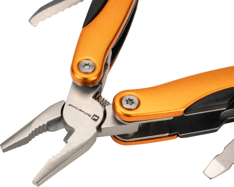 The multitool has 13 tools, including: pliers, file, flat and Philips screwdriver, knife, saw, bottle opener and can opener. The tool is packed in a neoprene cover.